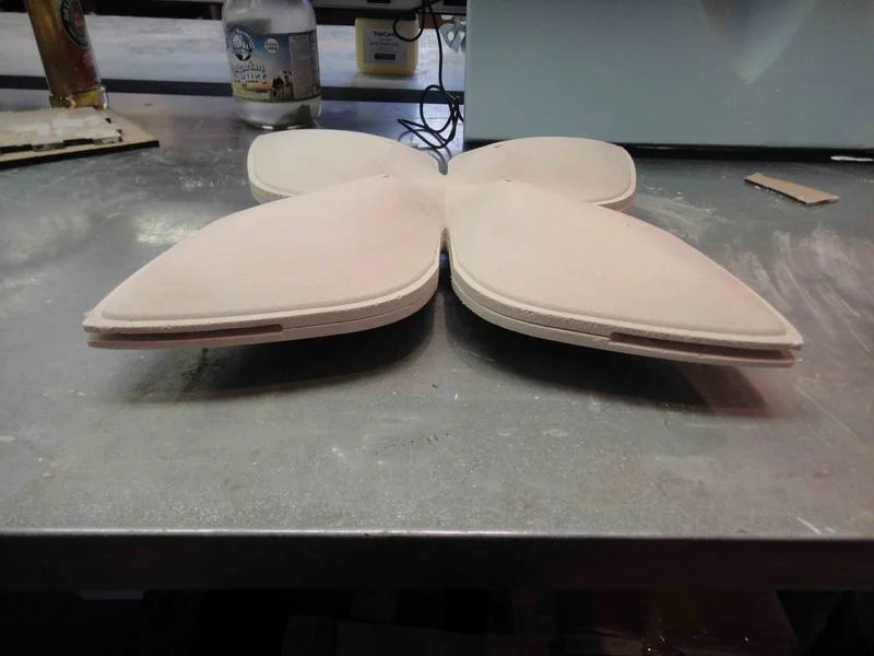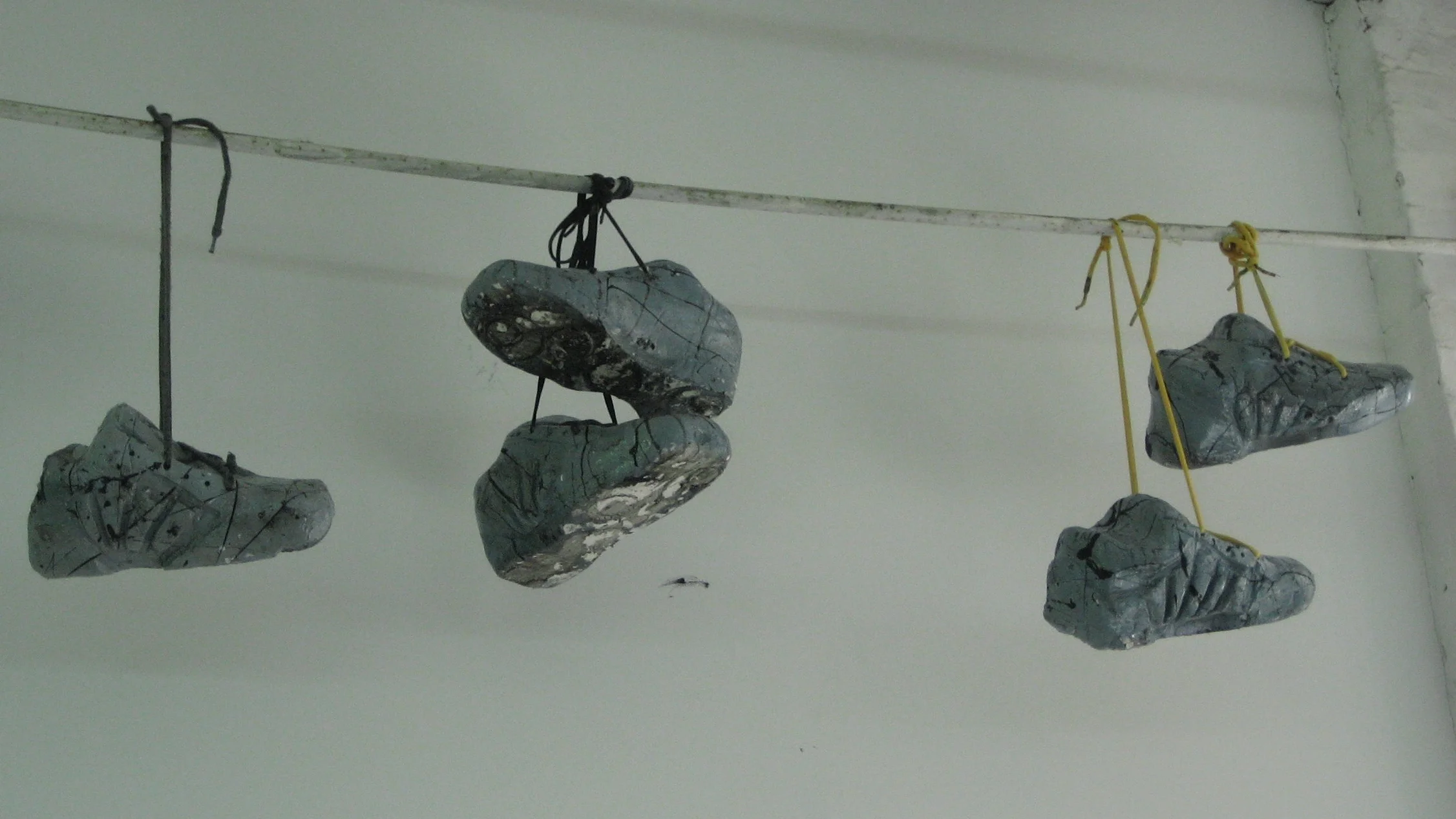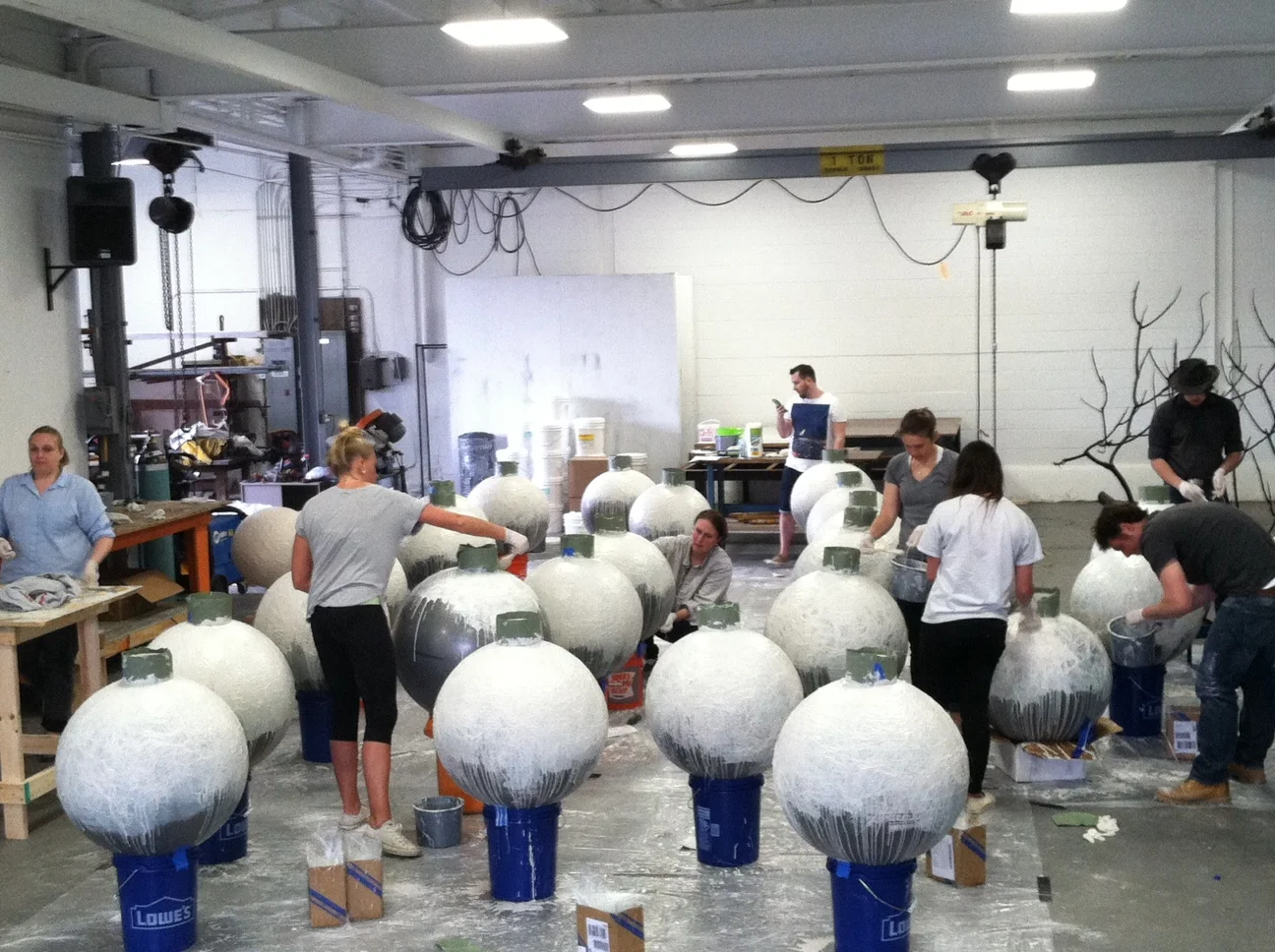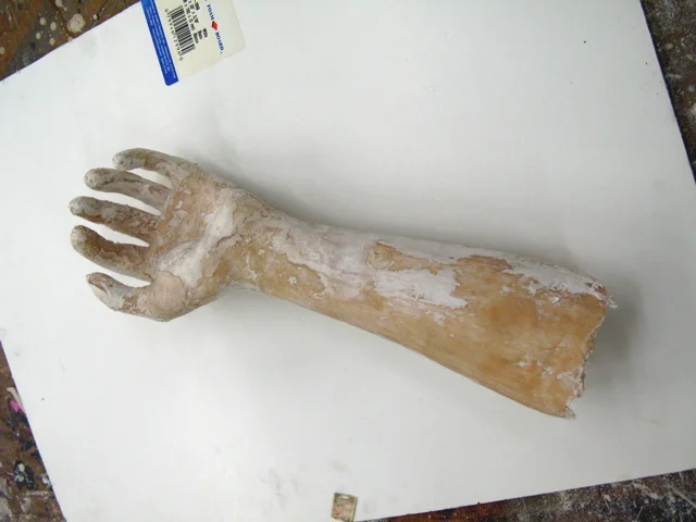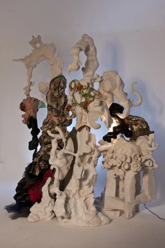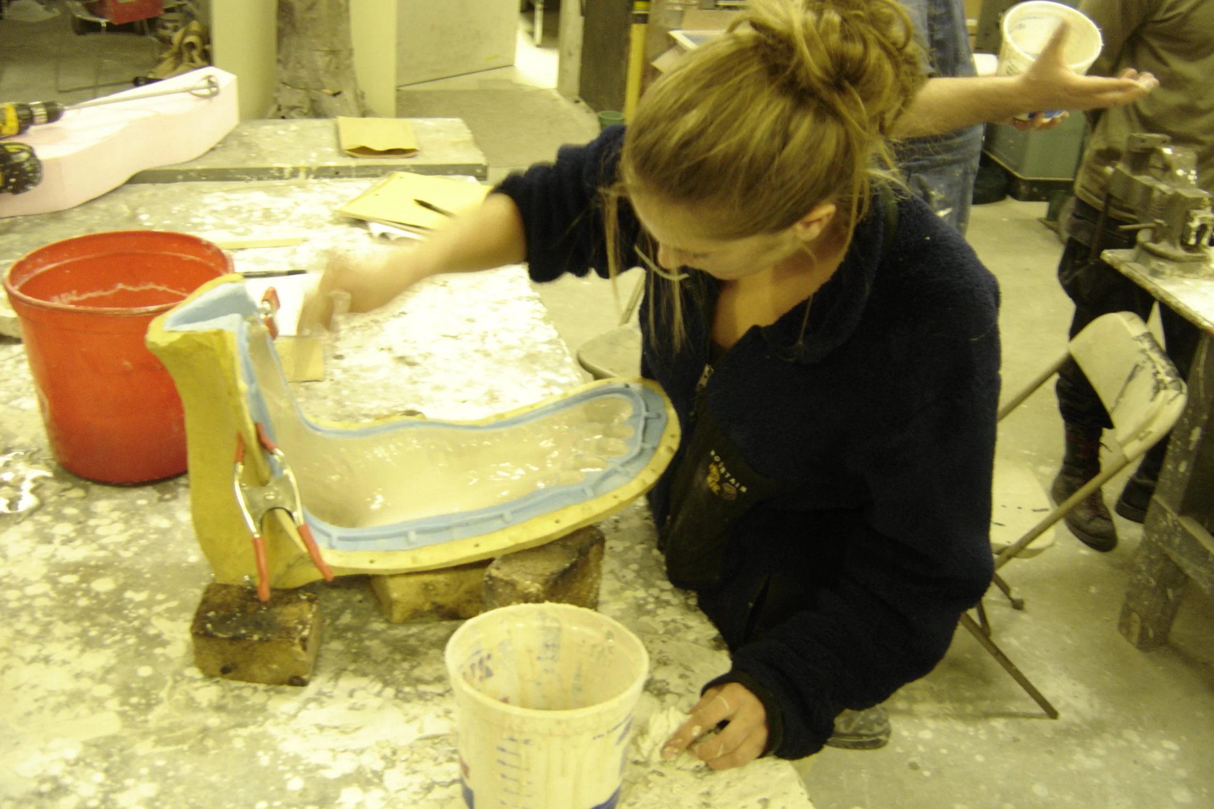 An assemblage of wooden armatures, supporting sculpted ridged foam shapes, were given a hard surface finish coating with Aqua-Resin and lastly 'dressed' by the students.