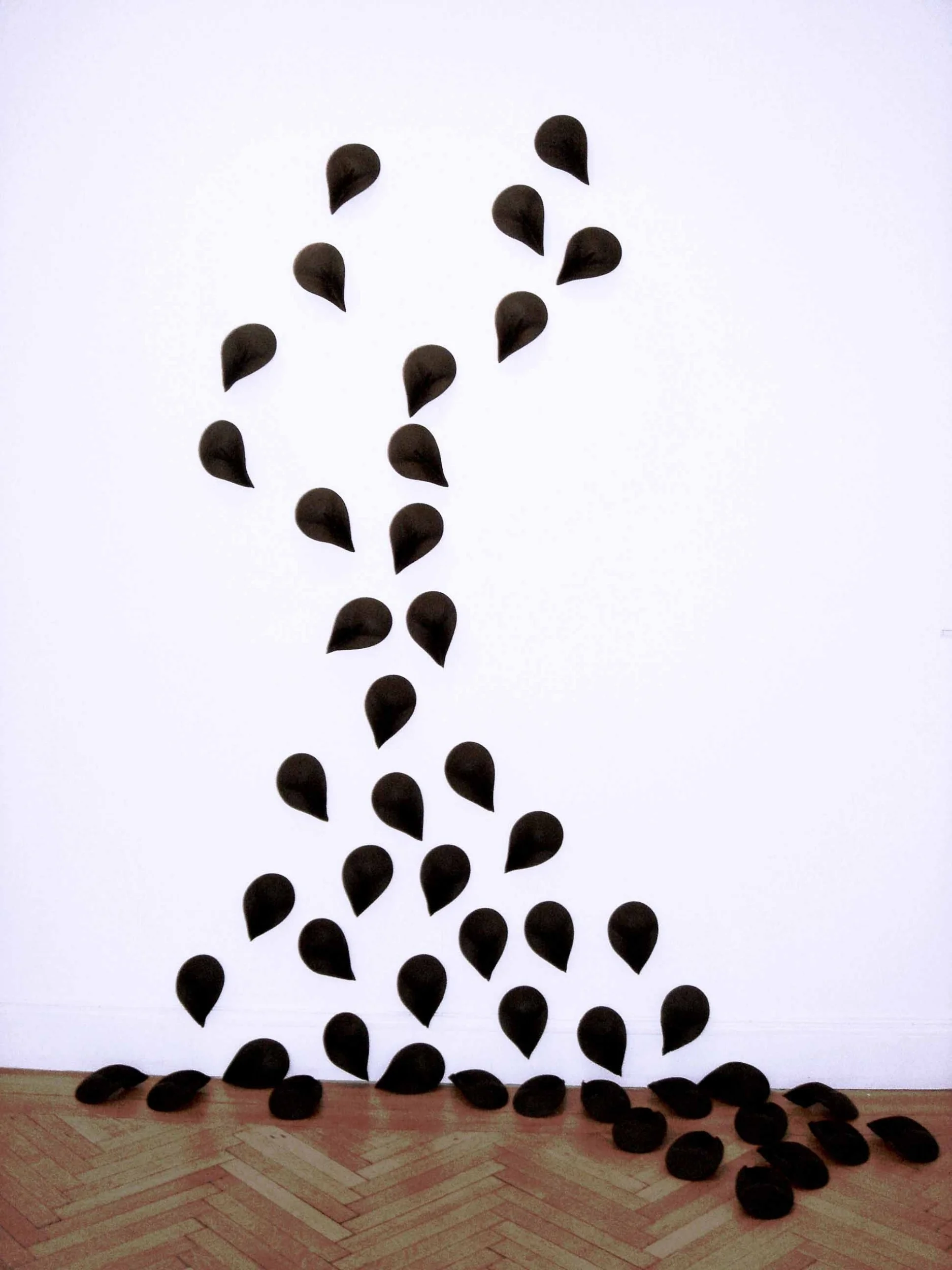 The sphere is installed partially protruding through a wall with access to the interior by a single viewer who climbs a stepladder and puts their head through a single hole in the sphere.